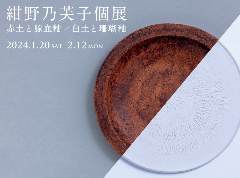 MON Galleryでは、1月20日から2月12日まで紺野乃芙子個展、赤土と豚血釉/白土と珊瑚釉を開催します。