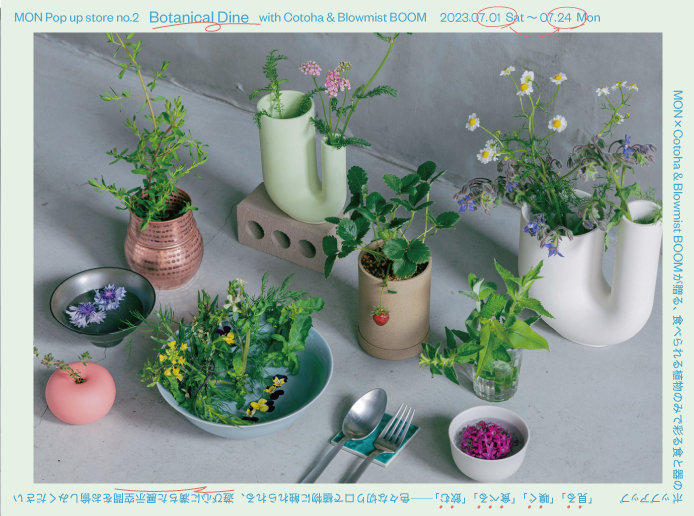 MON Galleryでは、〈植物×食〉をテーマにしたポップアップを開催します。エディブルフラワーやハーブなどの食べられる〈植物〉を、MONがセレクトした魅力的な〈器〉に生けて展示します。アレンジメントは京都二条の観葉植物専門店「cotoha」と花屋「Blowmist BOOM」が手掛け、会期中には展示にまつわるワークショップも。また、MON Wine Barでは植物を用いた特別メニューをご用意しています。「見る」「嗅ぐ」「食べる」「飲む」──色々な切り口で植物に触れられる、遊び心に満ちた展示空間をお愉しみください。